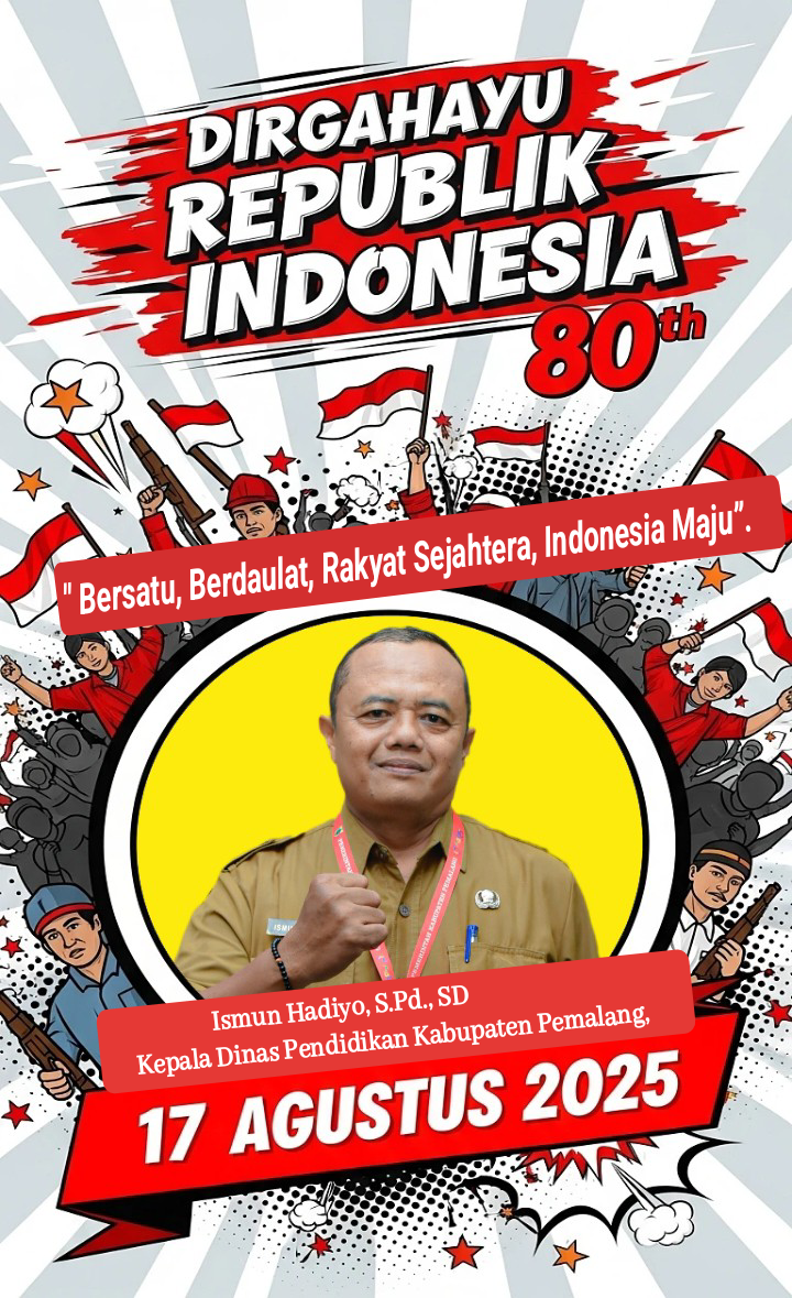 Mari kita jadikan momentum HUT RI ke-80 ini sebagai pengingat akan pentingnya membentuk generasi yang cerdas, berkarakter, dan berwawasan kebangsaan. Pendidikan adalah kunci kemajuan bangsa. Oleh karena itu, kami berkomitmen untuk terus menghadirkan layanan pendidikan yang berkualitas, merata, dan berkeadilan bagi seluruh anak bangsa di Kabupaten Pemalang tercinta.
