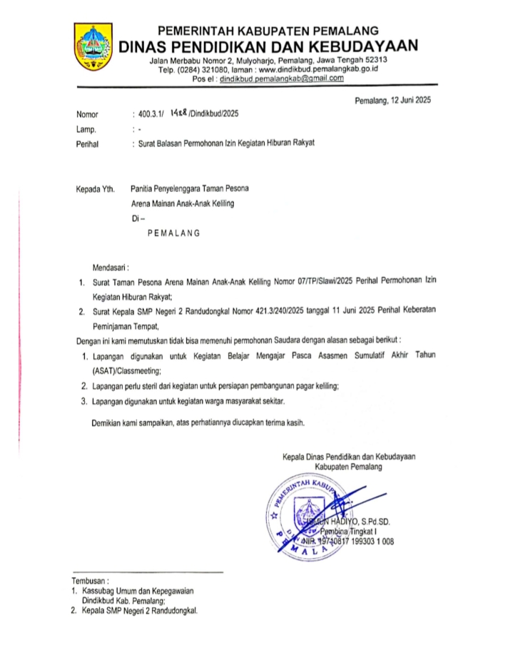Namun, rencana tersebut akhirnya ditolak pihak sekolah. Penolakan diperkuat dengan surat resmi dari Kadindikbud Pemalang Nomor: 400.3.1/1432/Dindikbud/2025 tertanggal 12 Juni 2025. Alasan penolakan antara lain keberatan dari Kepala SMP Negeri 2 Randudongkal, persiapan kegiatan ASAT, serta penggunaan lapangan untuk masyarakat.