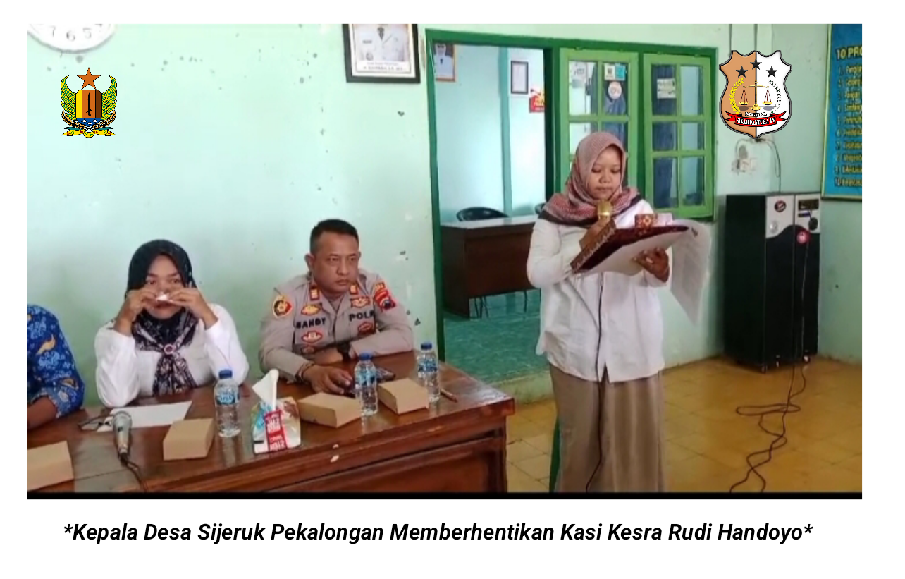 – Kepala Desa Sijeruk, Ruti’ati, memimpin rapat terkait pemberhentian Rudi Handoyo sebagai Kasi Kesra Desa Sijeruk pada Jumat, 25 April 2025. Rapat ini dihadiri oleh Sekcam Sragi, Mukhtar Khoddari, Kapolsek Sragi, Danramil Sragi, dan warga masyarakat Desa Sijeruk.