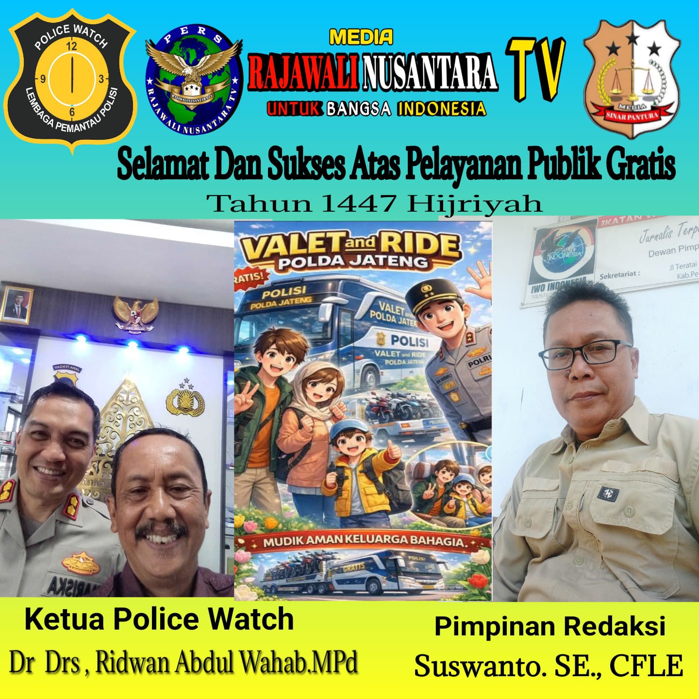 – Ketua Police Watch, Dr. Drs. Ridwan Abdul Wahab, M.Pd, bersama Suswanto, S.E., CFLE, menyampaikan ucapan selamat dan sukses atas terselenggaranya program pelayanan publik Mudik Gratis Tahun 1447 Hijriyah / 2026.