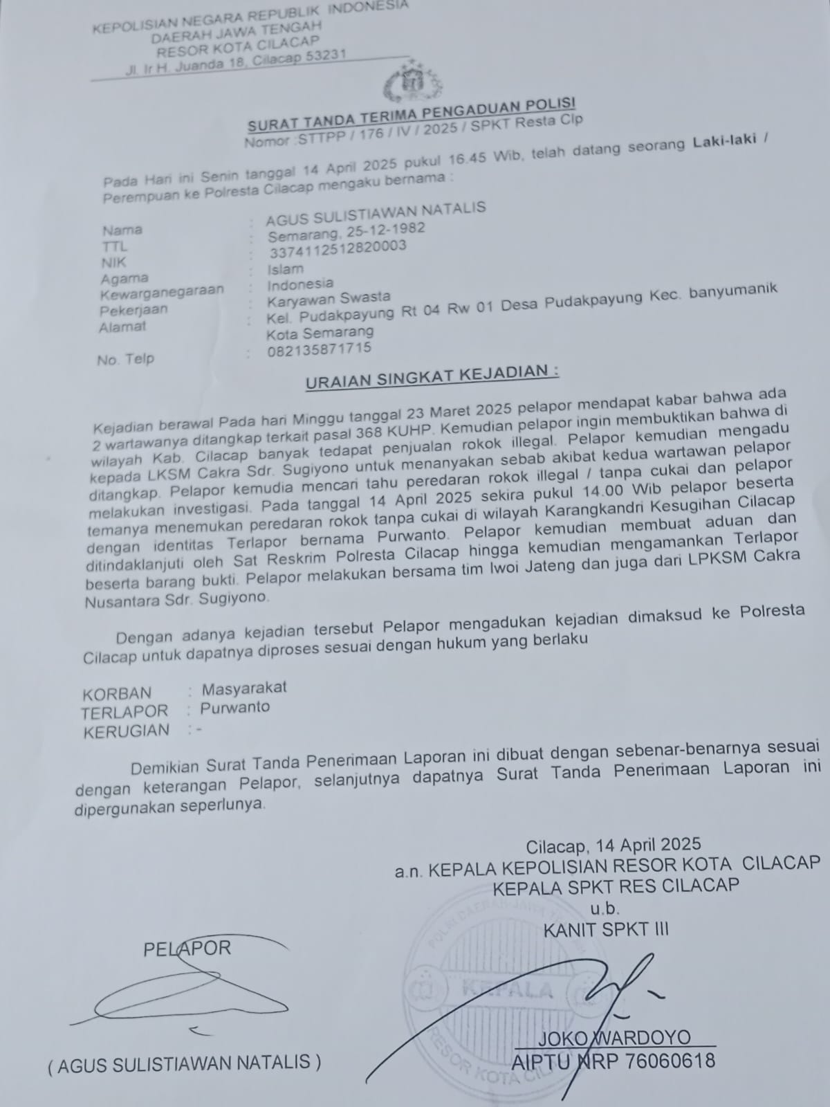 Sebagai bentuk keseriusan, Aliansi dan IWOI Jateng juga telah melayangkan surat aduan kepada Polresta Cilacap dengan nomor STTP/176/IV/2025/SPKT Resta CLP tertanggal 14 April 2025. Namun, hingga kini belum ada tindak lanjut dari penyidik Unit 3 Polresta Cilacap.
