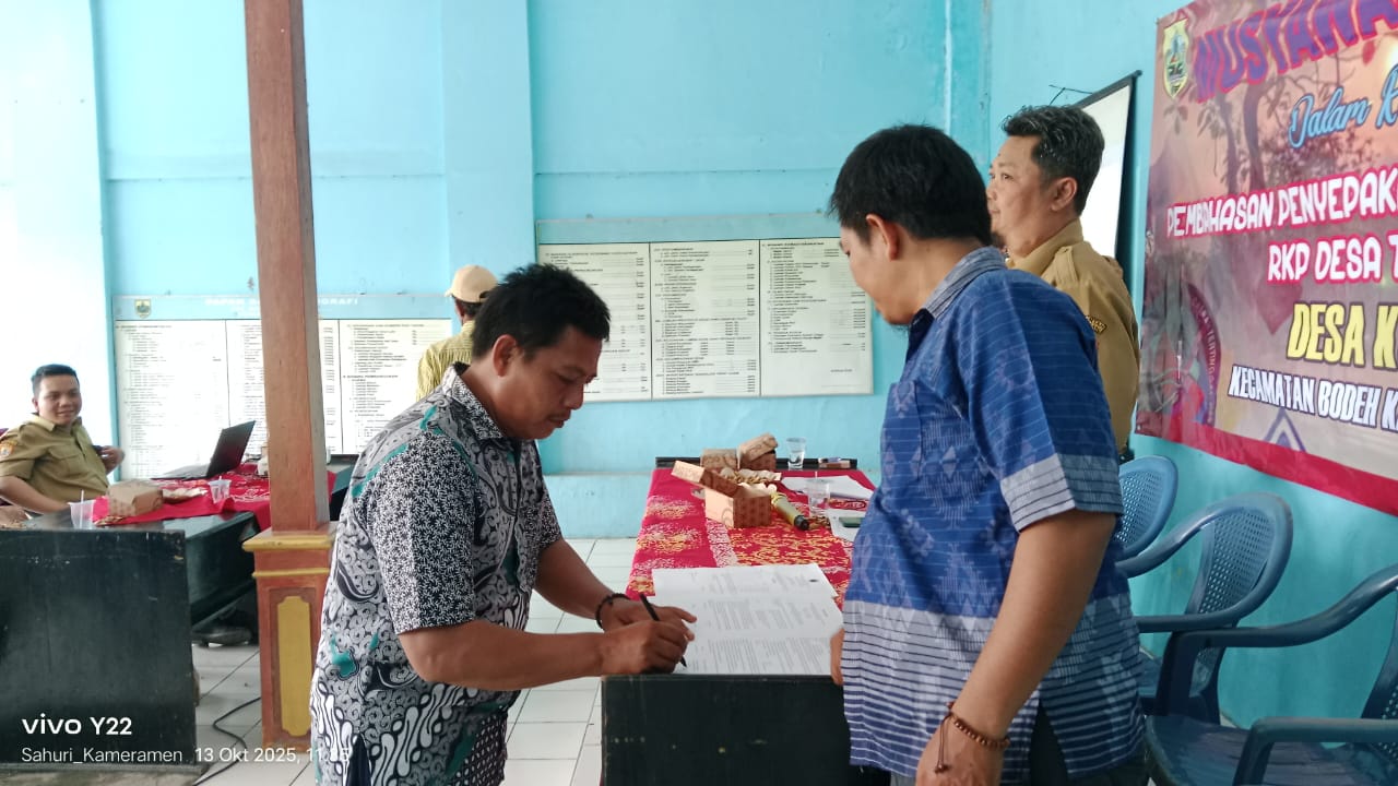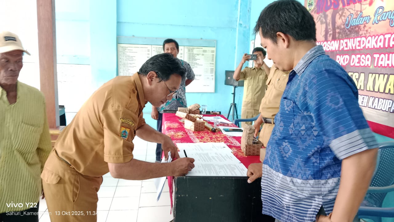 Musyawarah mencatat hasil musyawarah desa termasuk kesepakatan dan keputusan yang diambil, melalui penandatangan dokumen oleh Kepala Desa Kwasen Sunarto dan pihak-pihak terkait.