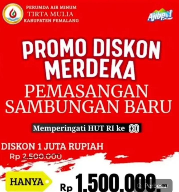 Promo ini, yang menjadi tradisi PDAM Pemalang setiap perayaan hari besar nasional, bertujuan untuk mempermudah akses masyarakat terhadap layanan air bersih yang berkualitas. “Kami ingin memastikan lebih banyak warga Pemalang dapat menikmati air bersih yang layak dan terjangkau, sekaligus merayakan semangat kemerdekaan,” ujar perwakilan manajemen PDAM Tirta Mulia.