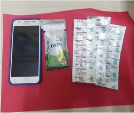 Dari hasil penggeledahan, petugas menemukan 30 butir Alprazolam yang disembunyikan di dalam dasbor sepeda motor pelaku, serta 5 butir lainnya ditemukan di dalam rumahnya. Selain obat-obatan terlarang tersebut, polisi juga mengamankan barang bukti lain berupa 1 unit sepeda motor Beat warna hitam, 1 ponsel Samsung J5, 1 tas selempang hitam kecil, dan bungkus rokok yang digunakan sebagai tempat penyimpanan sementara.