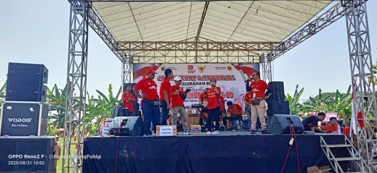 – Pengurus Karangtaruna Kelurahan Beji Kecamatan Taman bekerja sama dengan Pemerintah Kelurahan menggelar kegiatan jalan sehat dan karnaval dalam rangka memeriahkan HUT ke-80 Republik Indonesia, Minggu (31/8/2025).