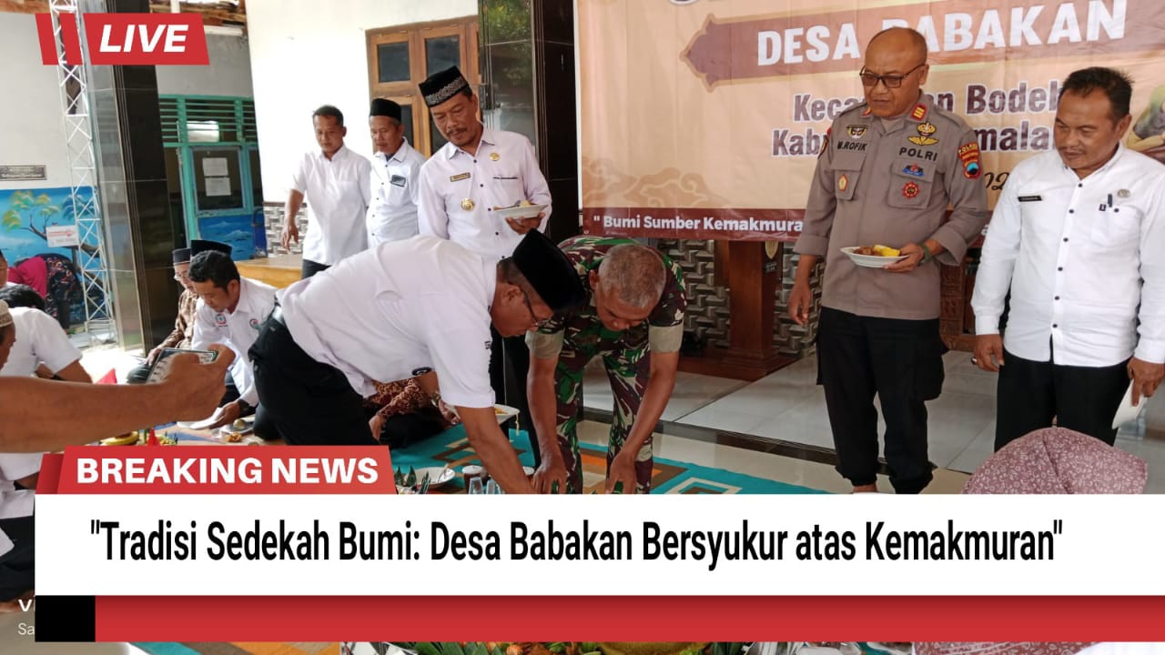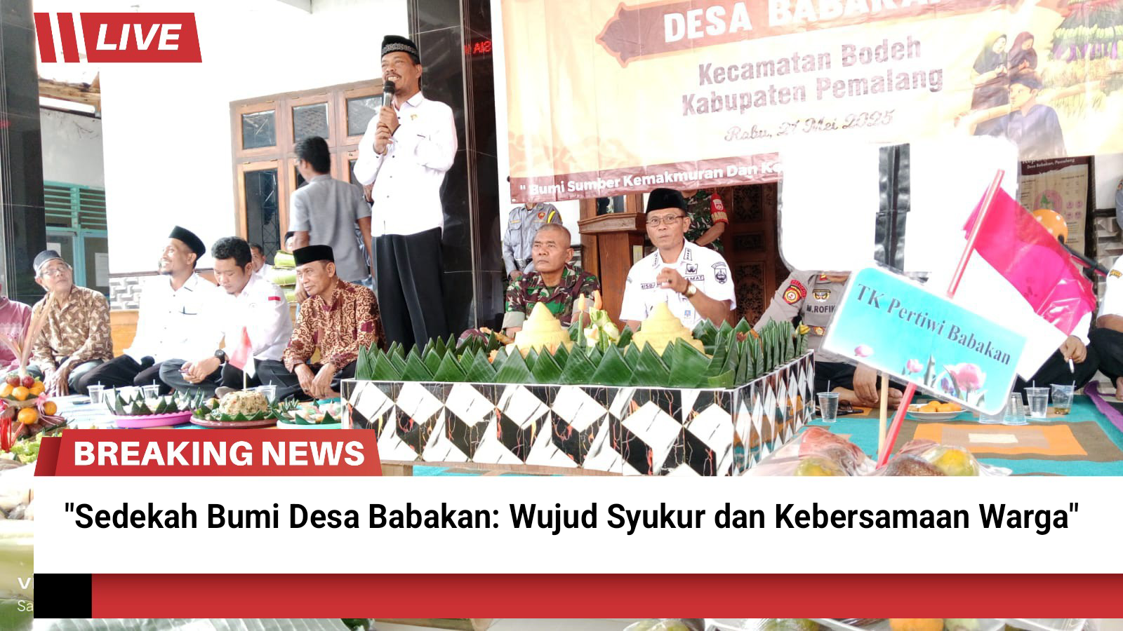 – Pemerintah Desa Babakan, Kecamatan Bodeh, Kabupaten Pemalang, bekerja sama dengan warga masyarakat mengadakan acara rutinan sedekah bumi pada Rabu, 21 Mei 2025. Acara ini dimeriahkan dengan prosesi arak-arakan gunungan hasil bumi dari Dukuh Kwaringan menuju Balai Desa Babakan.
