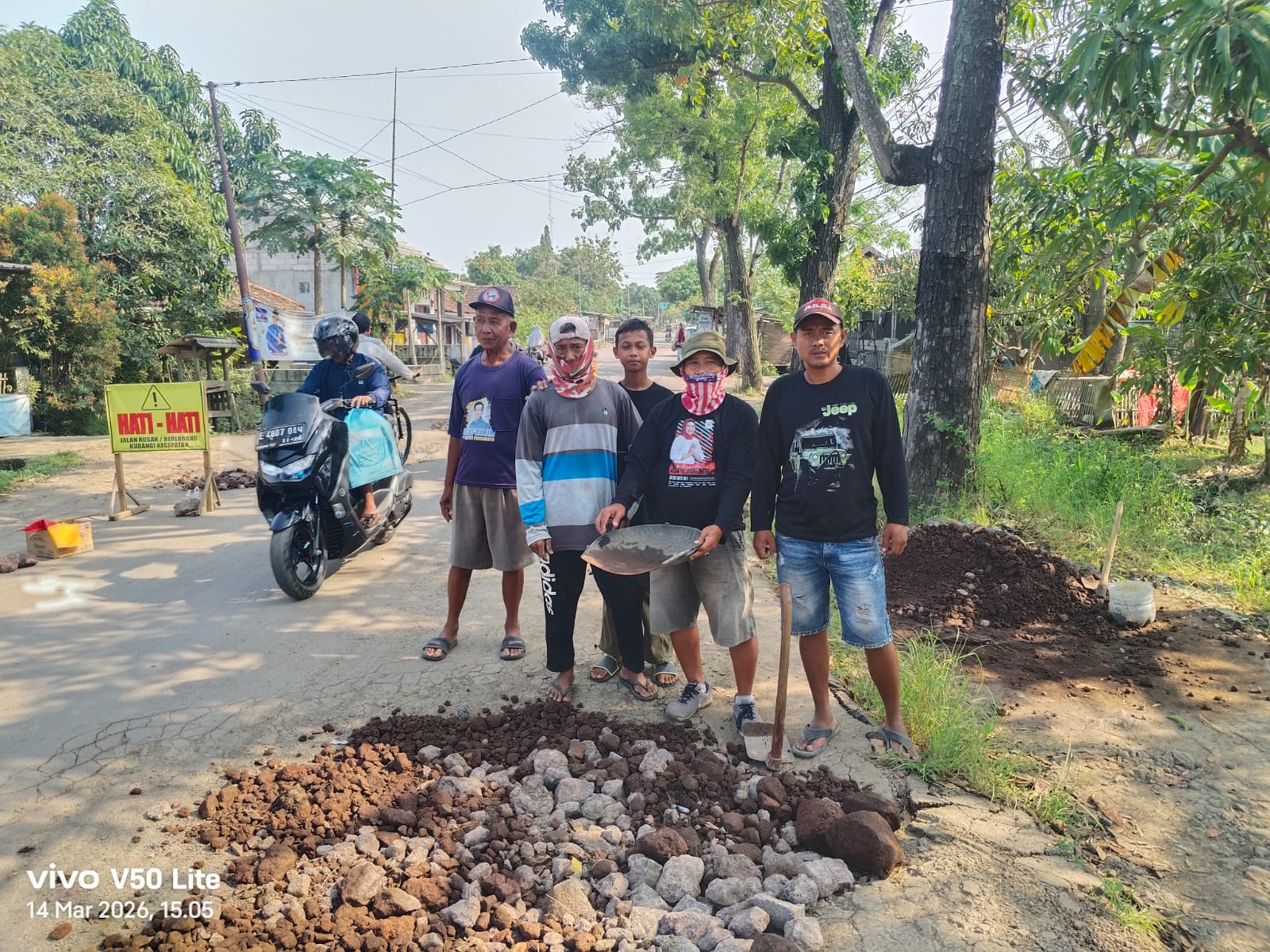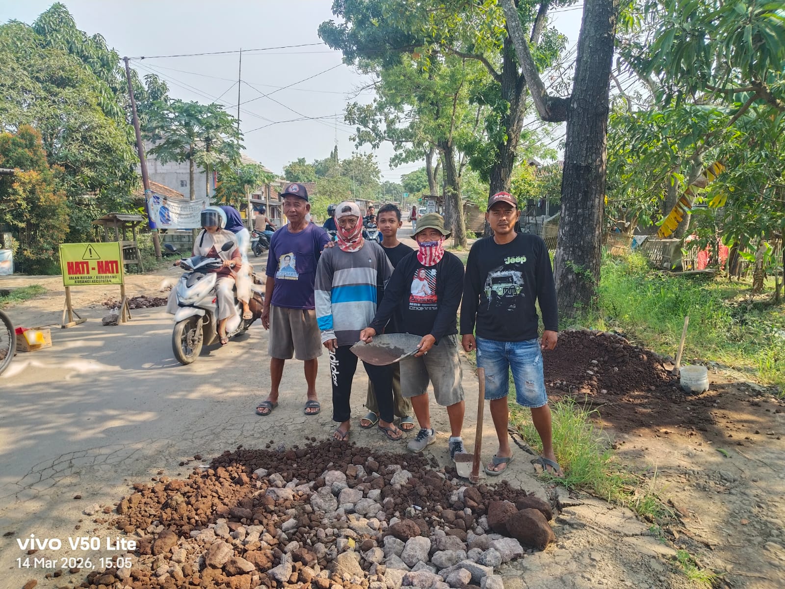 Kondisi jalan yang rusak parah dan dipenuhi lubang membuat para warga tergerak untuk melakukan pengurugan menggunakan material seadanya. Kegiatan tersebut dilakukan secara sukarela tanpa imbalan.